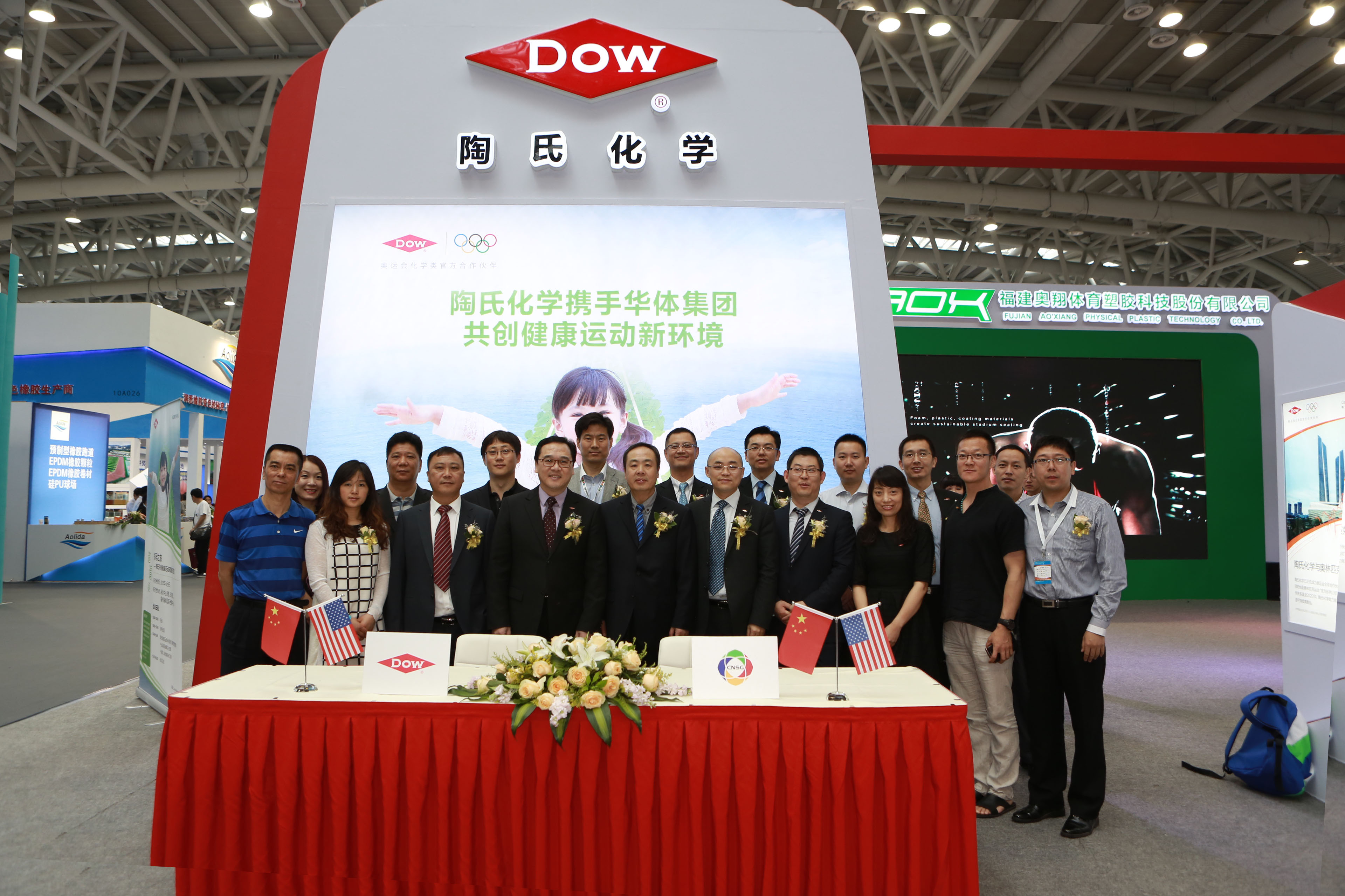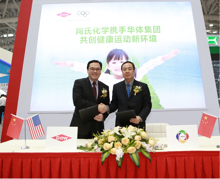 5月9日上午,陶氏化学与国内体育产业的领先企业华体集团有限公司正式签署协议,达成战略合作。华体集团成立于1993年,作为中国奥委会控股的企业集团,近年来活跃于奥运会、亚运会、全运会及大型体育场馆和全民健身设施建设,曾为鸟巢、水立方等重大体育项目提供专业服务。陶氏化学大中华区总裁黄祝龄(Peter Wong)和华体集团董事长张立增出席了当天的签约仪式。